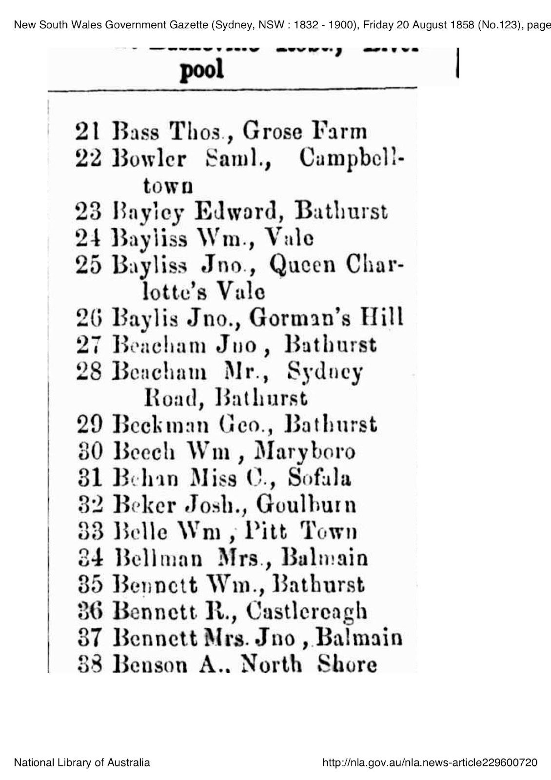 New South Wales Government Gazette (Sydney, NSW : 1832 - 1900), Friday 20 August 1858 (No.123) National Library of Australia http://nla.gov.au/nla.news-article229600720