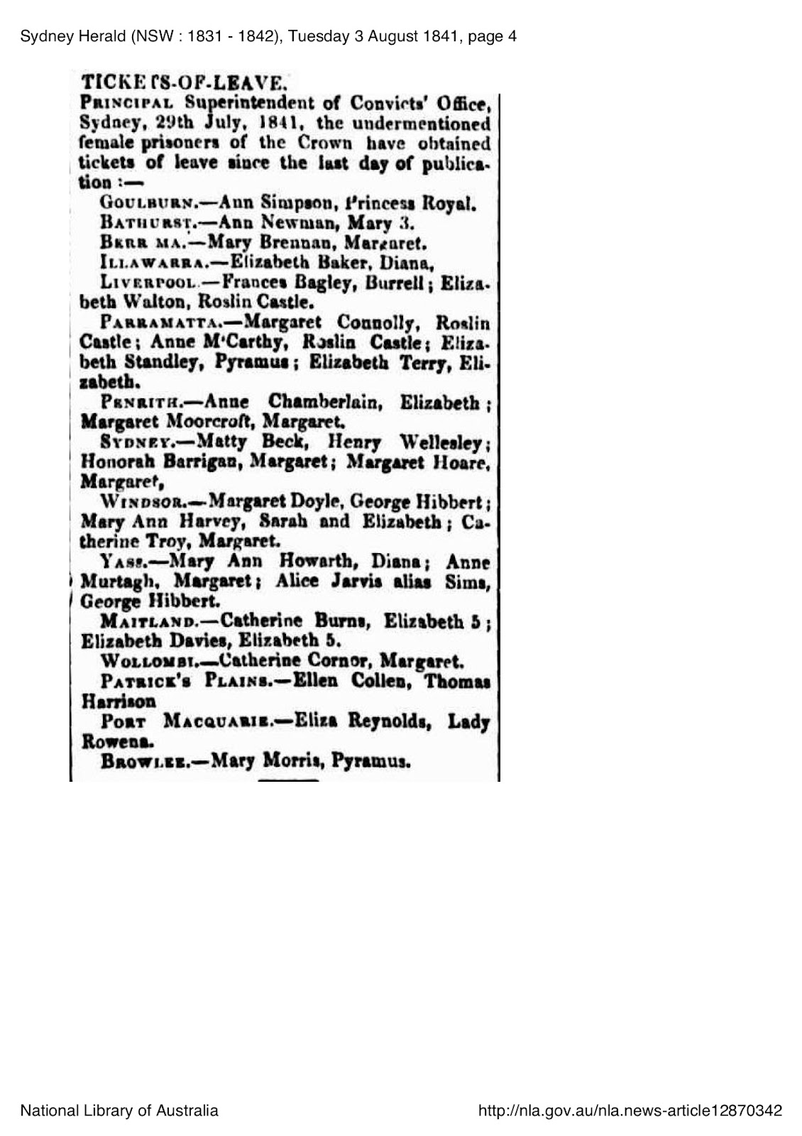 Sydney Herald (NSW : 1831 - 1842), Tuesday 3 August 1841, page 4 National Library of Australia http://nla.gov.au/nla.news-article12870342