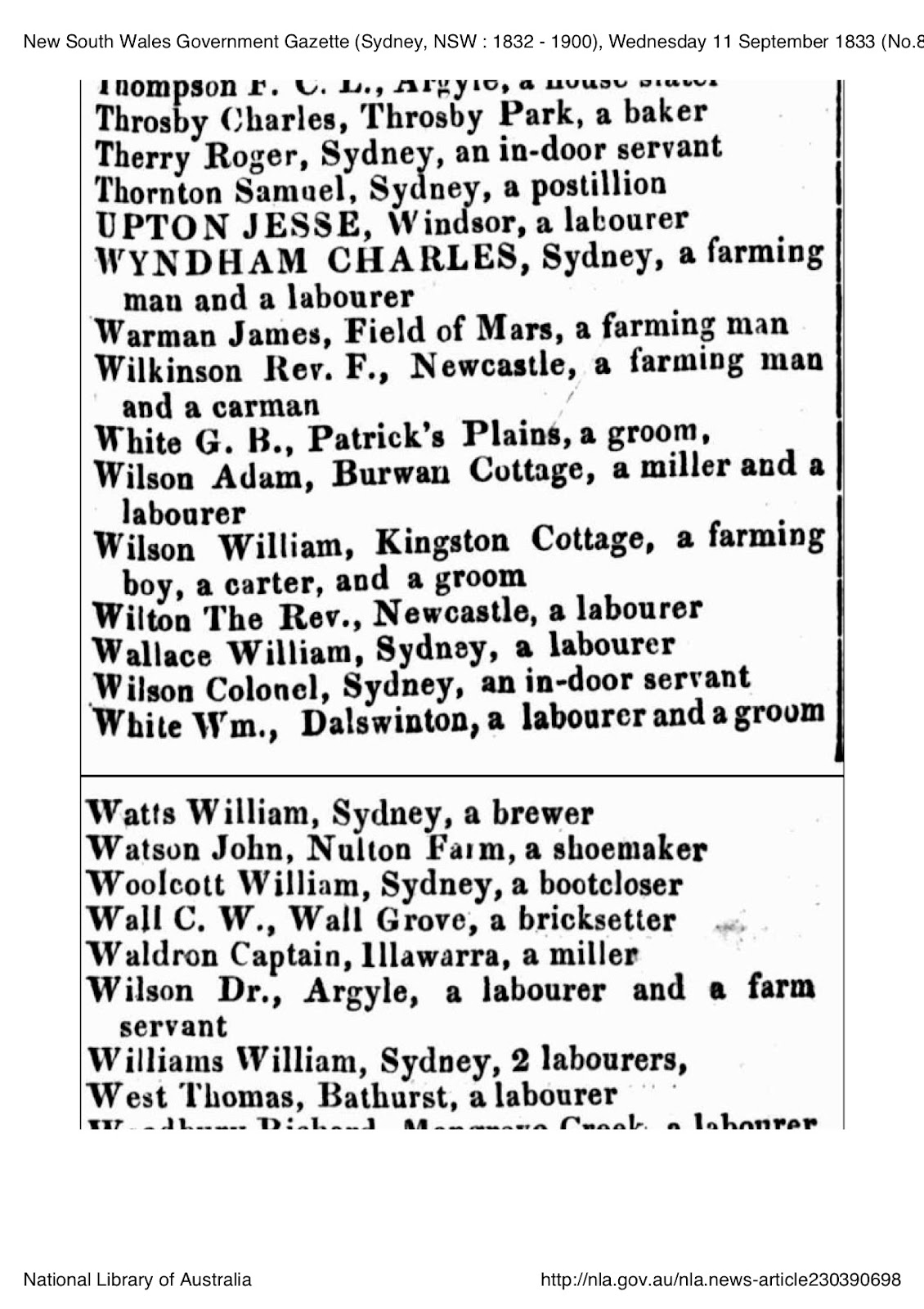 New South Wales Government Gazette (Sydney, NSW : 1832 - 1900), Wednesday 11 September 1833 (No.8) http://nla.gov.au/nla.news-article230390698